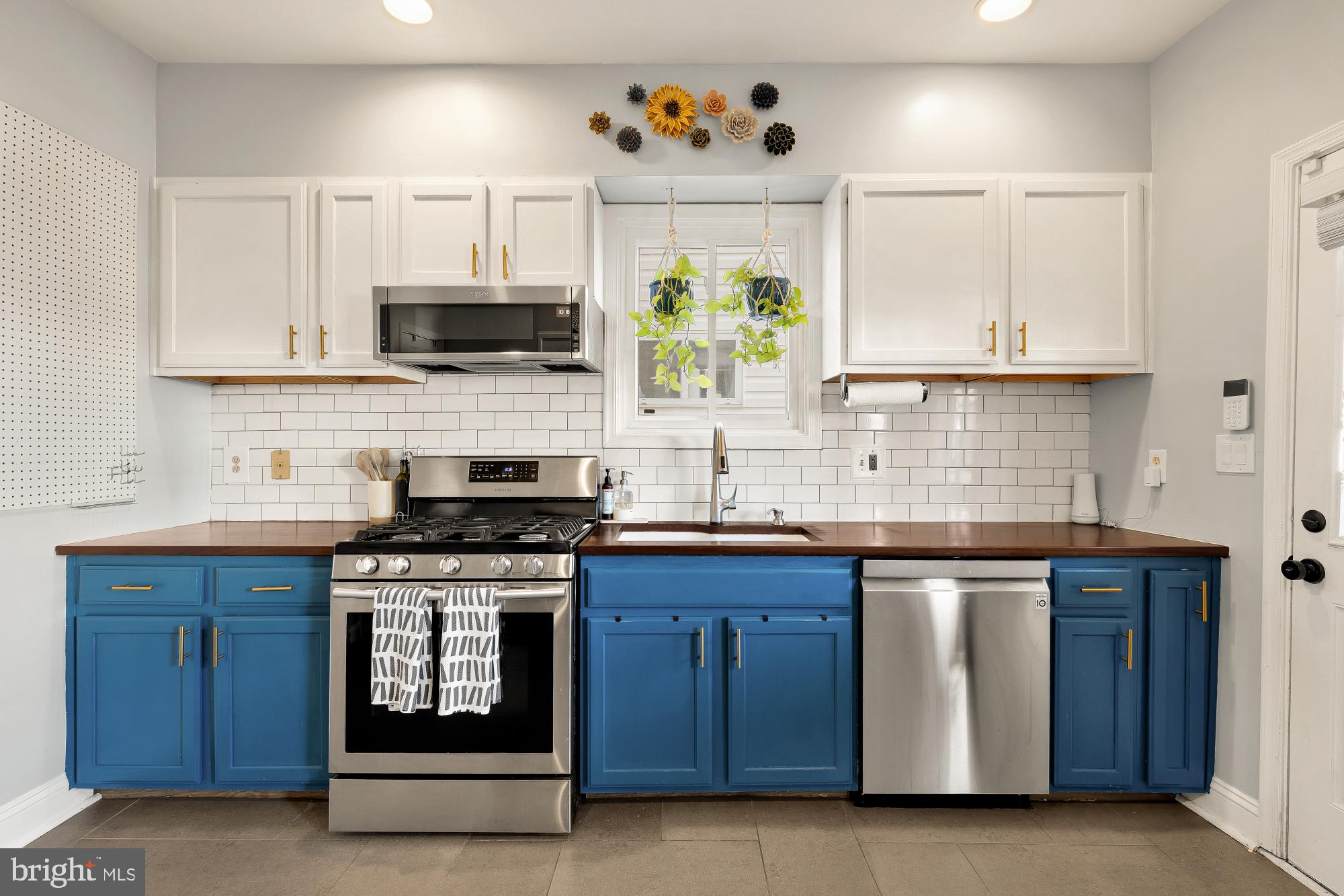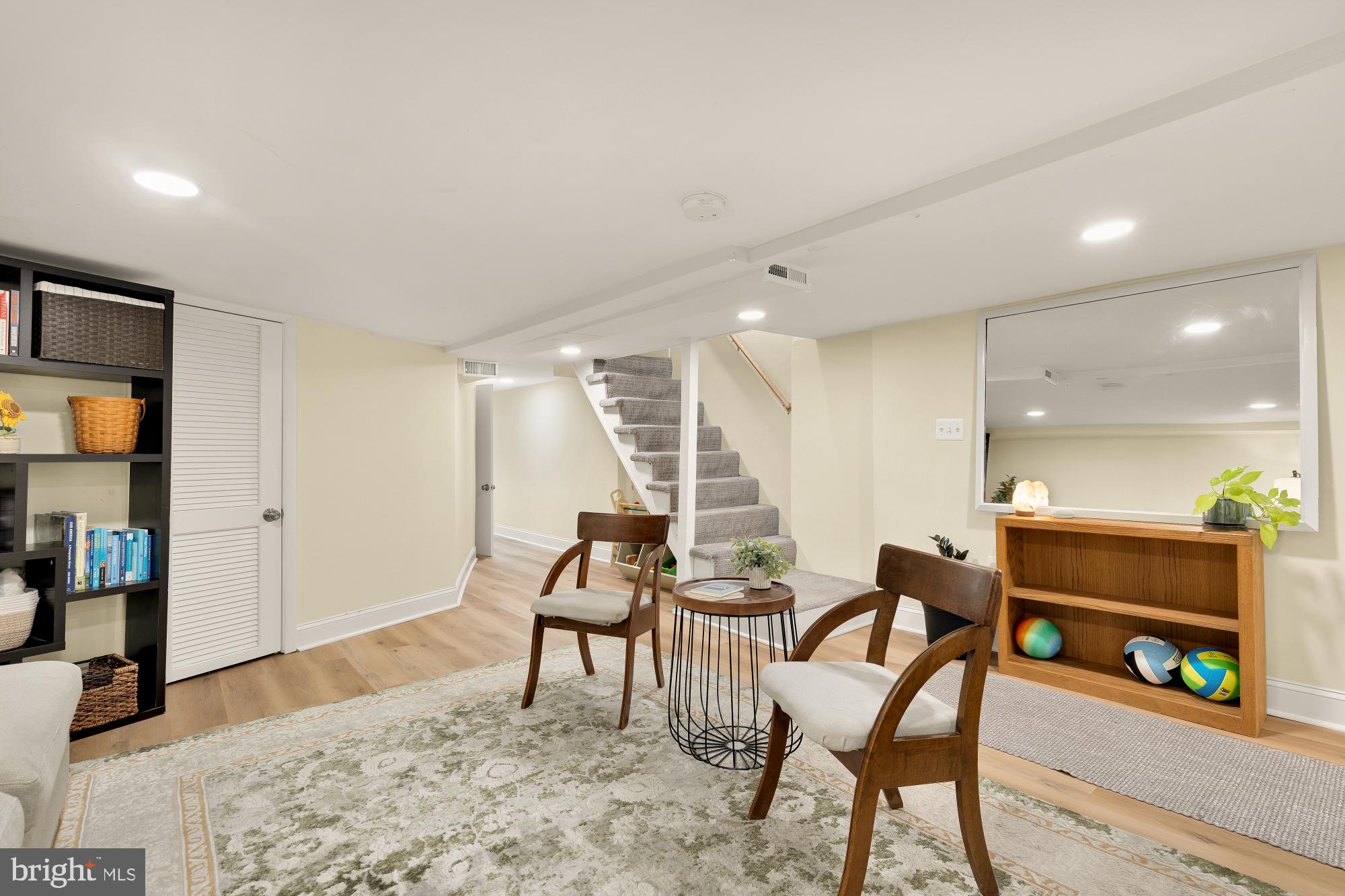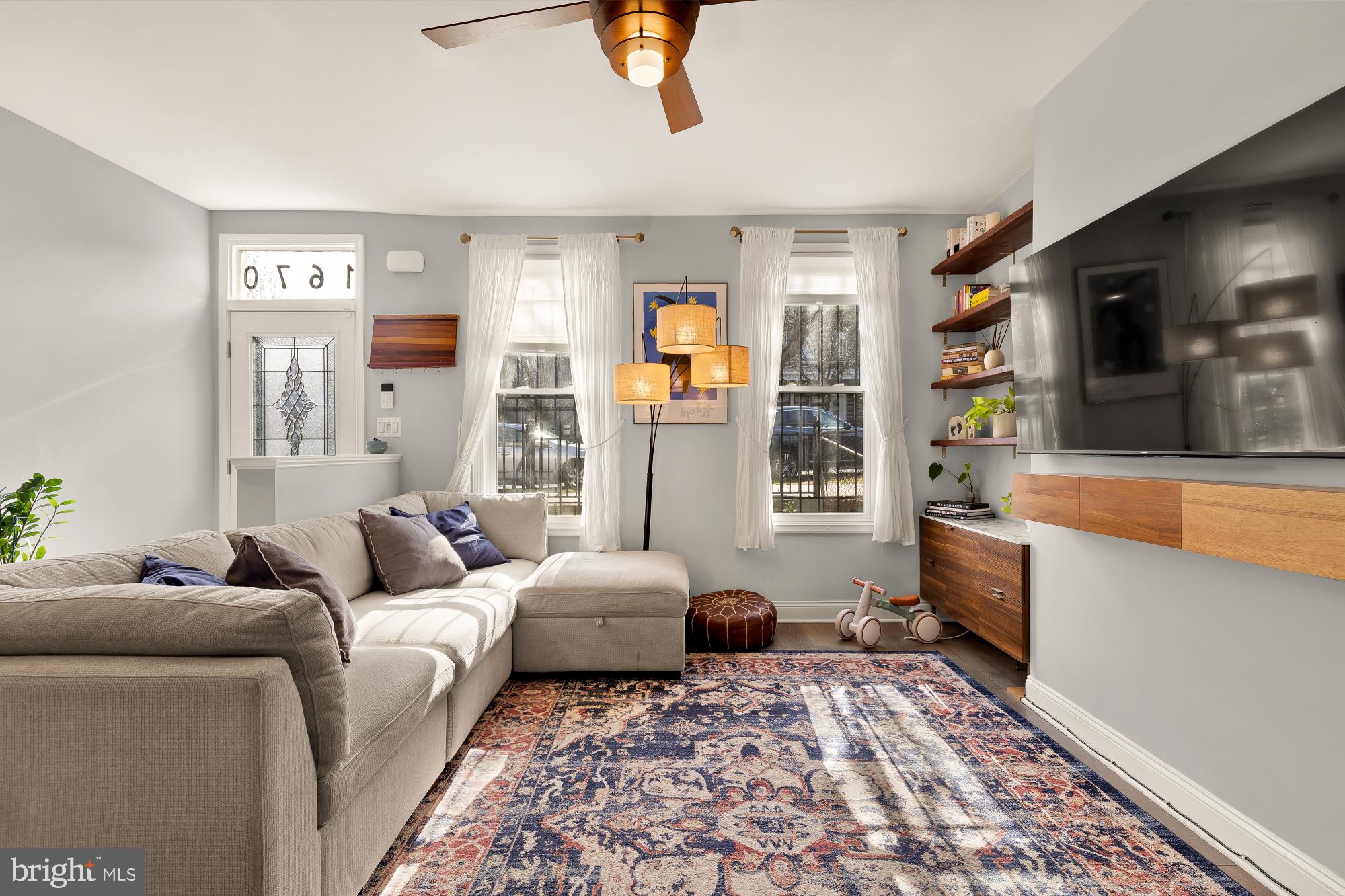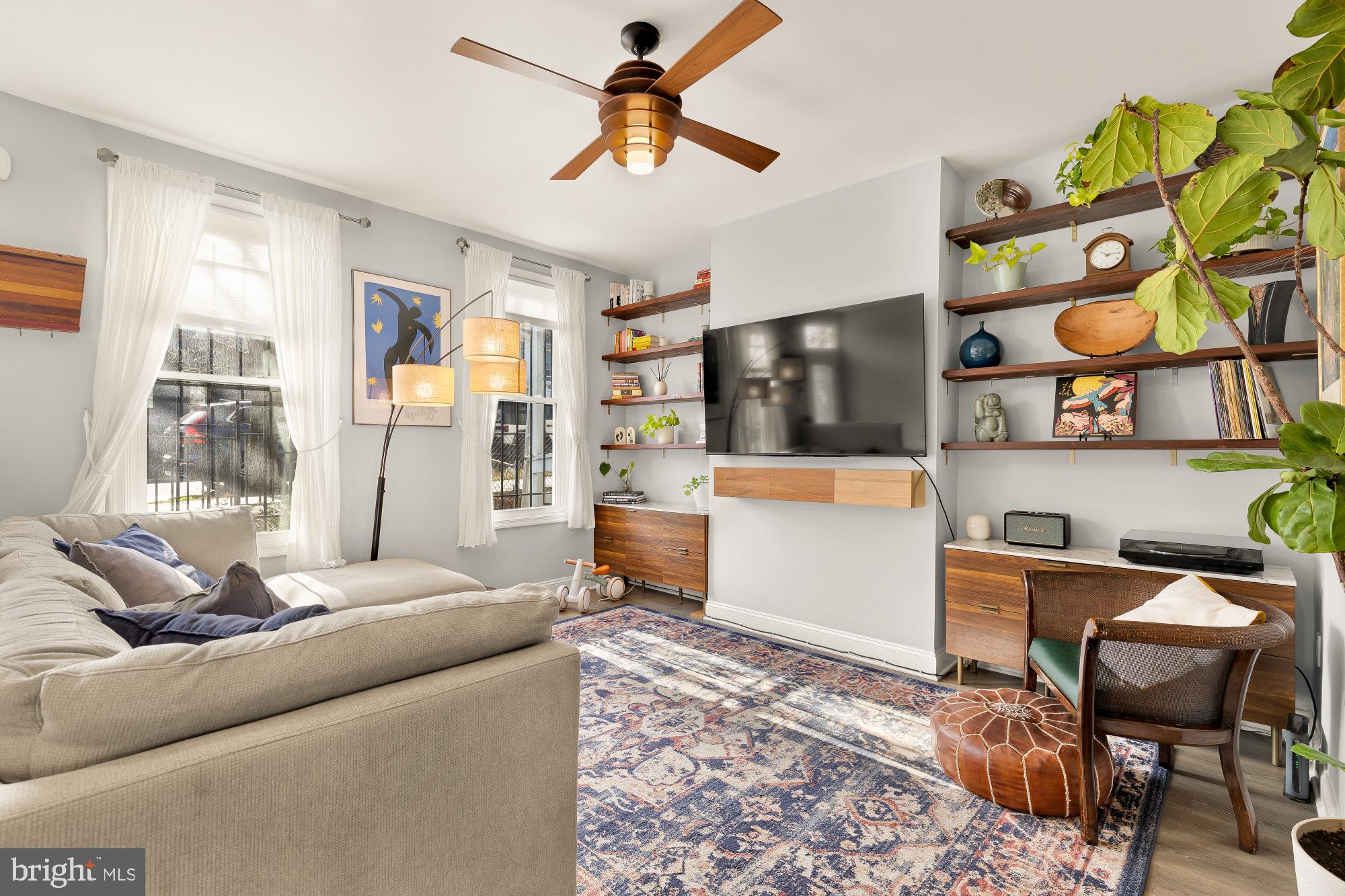 From the sweet, front stoop garden, step inside to an inviting main level that features a spacious living area with built-in bookcases--ideal for entertaining or unwinding after a long day. This space opens to a dining area and full bath, and continues to a large, stylish kitchen. A true chef's delight, the kitchen is equipped with modern appliances and leads to a private deck ideal for an evening conversation or meal.
