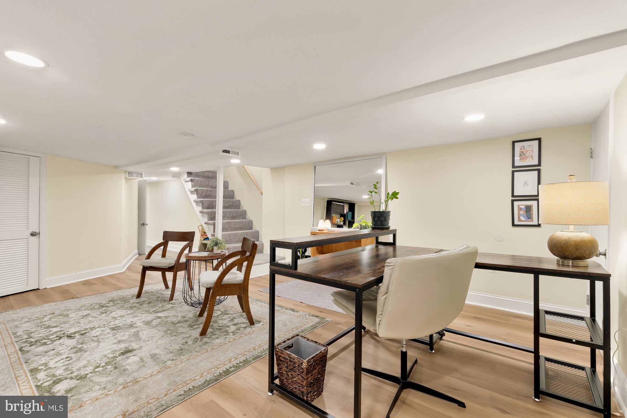 Upstairs, beautiful hardwood floors and skylights add warmth and light to the sleeping level. The primary bedroom is spacious and sunlit, and has room enough for a bonus office space. Two additional bedrooms offer versatility for guests or a home office. This level shares a large, full bath.