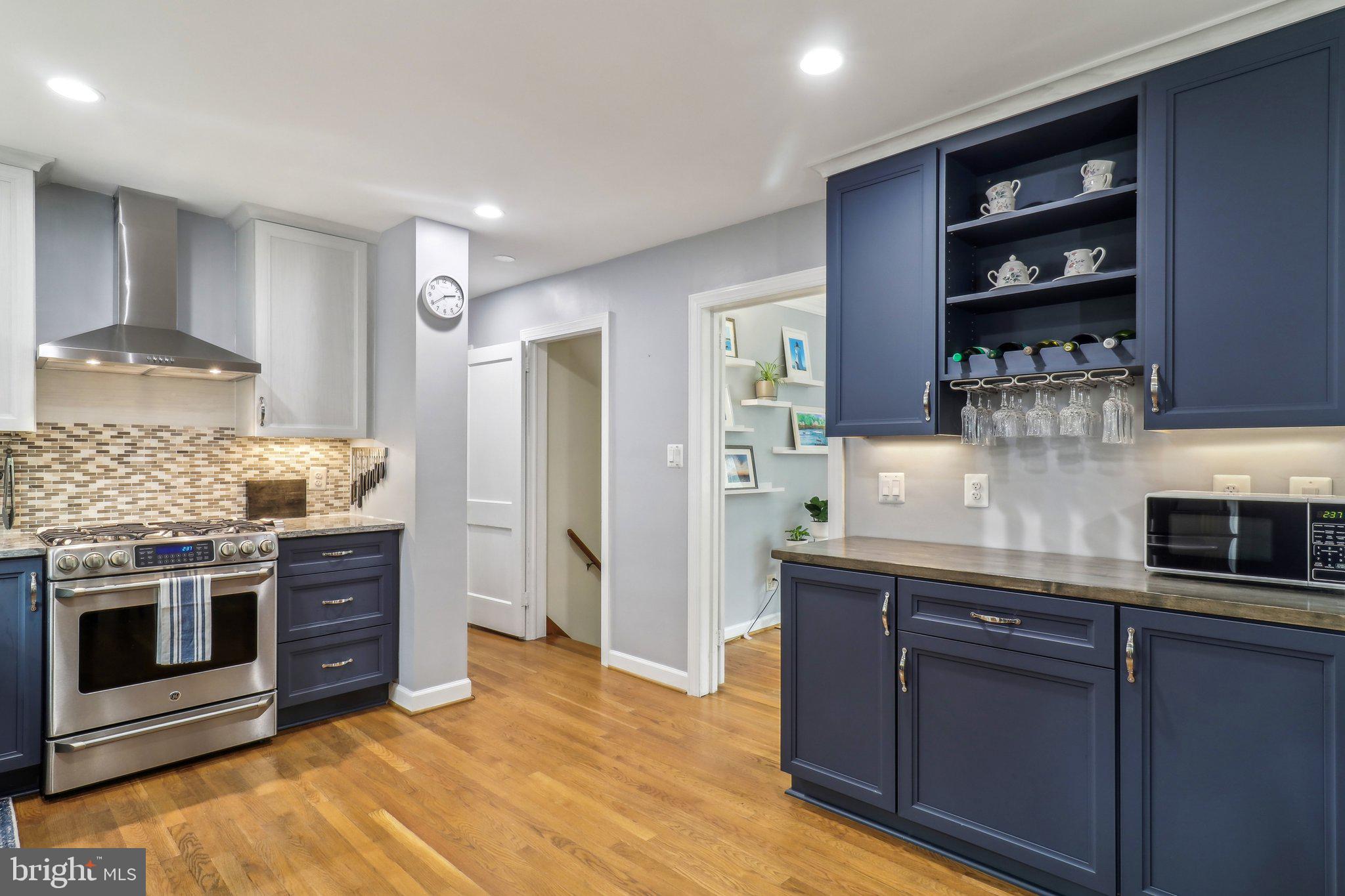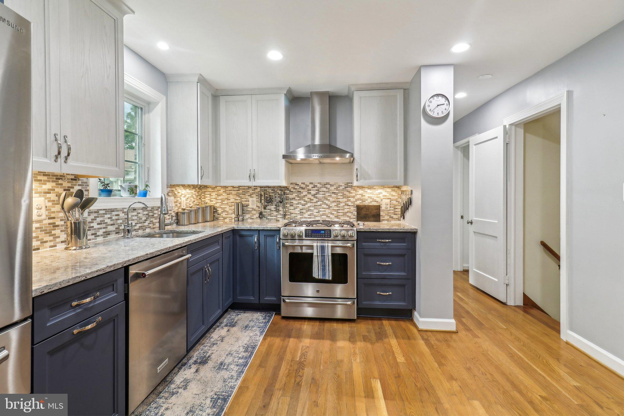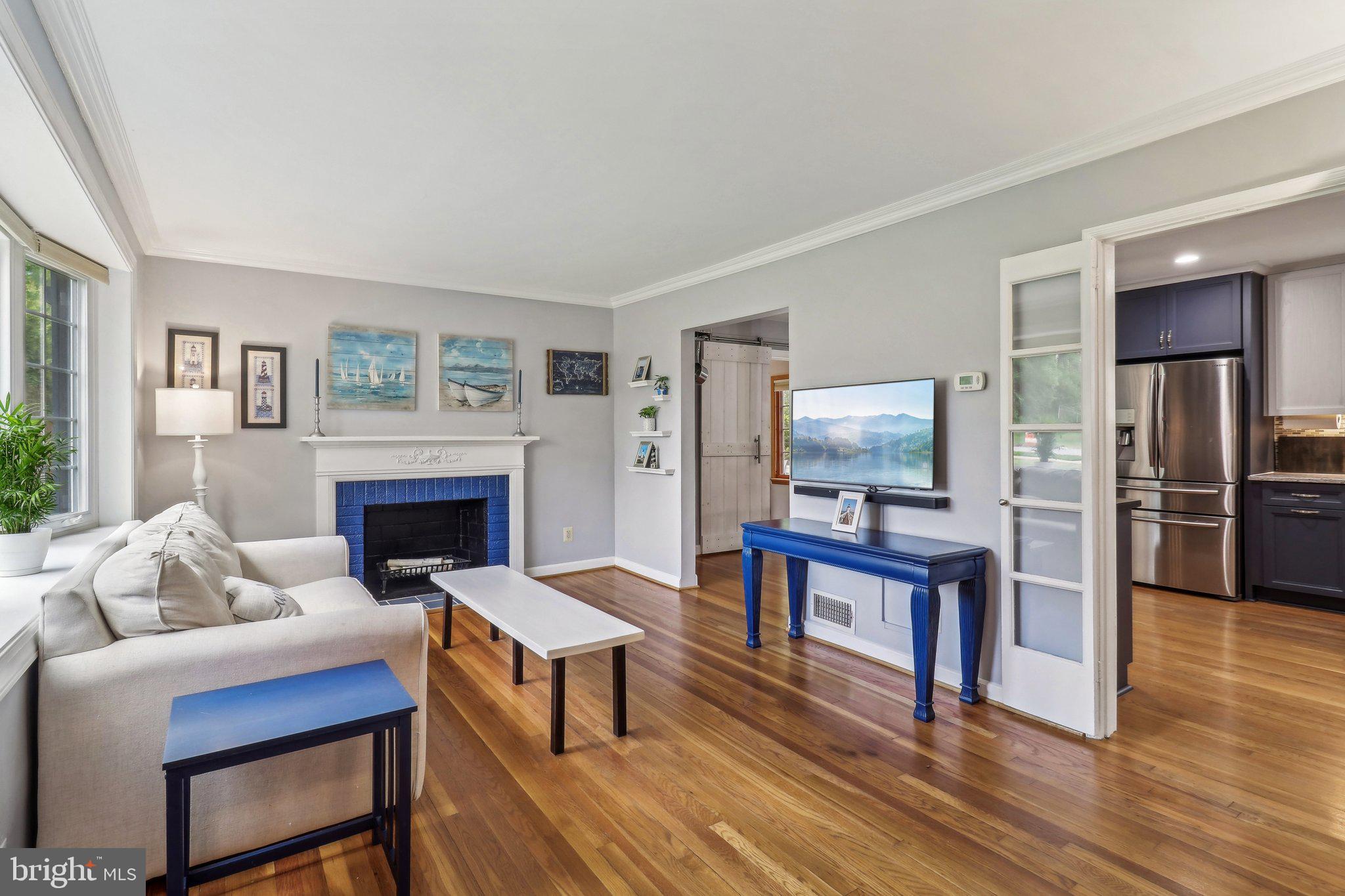 Inside, the living room is all warmth--original hardwoods, a wood-burning fireplace with a fresh tile hearth and painted brick (2023) and a wide bay window (2020) fitted with remote-control shades first installed in 2015. The space opens to the dining area and the 2024 kitchen makeover: two-tone cabinetry, granite that wears everyday life well, a mosaic backsplash, deep pantry storage, built-in wine rack and stem-glass holders, plus stainless appliances that include a gas range ready for serious cooking. Barn doors slide between the kitchen and the adjacent office, and another set closes off the office from a nearby bedroom, giving you flexible work-from-home privacy without eating floor space. An EV outlet added in 2022 sits just outside, so your car charges while dinner roasts.