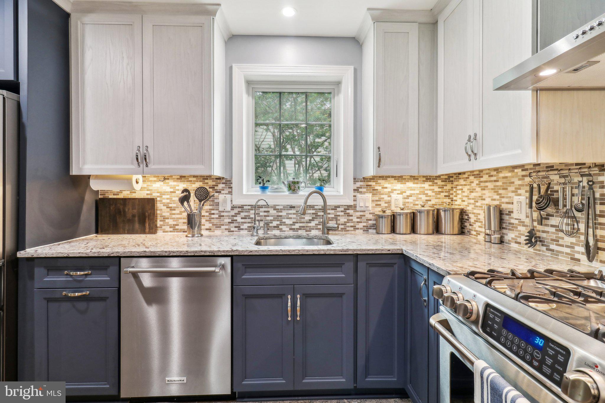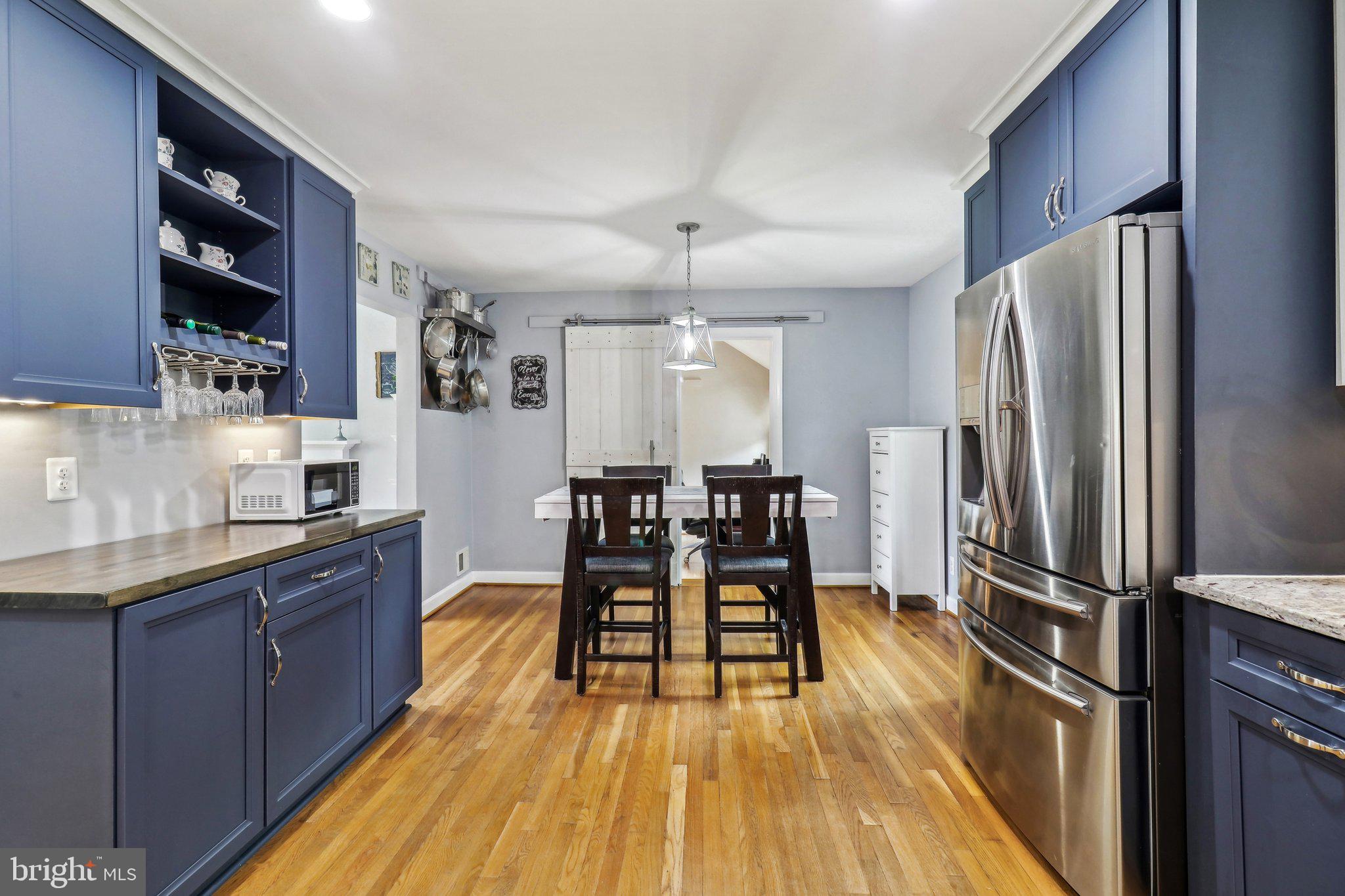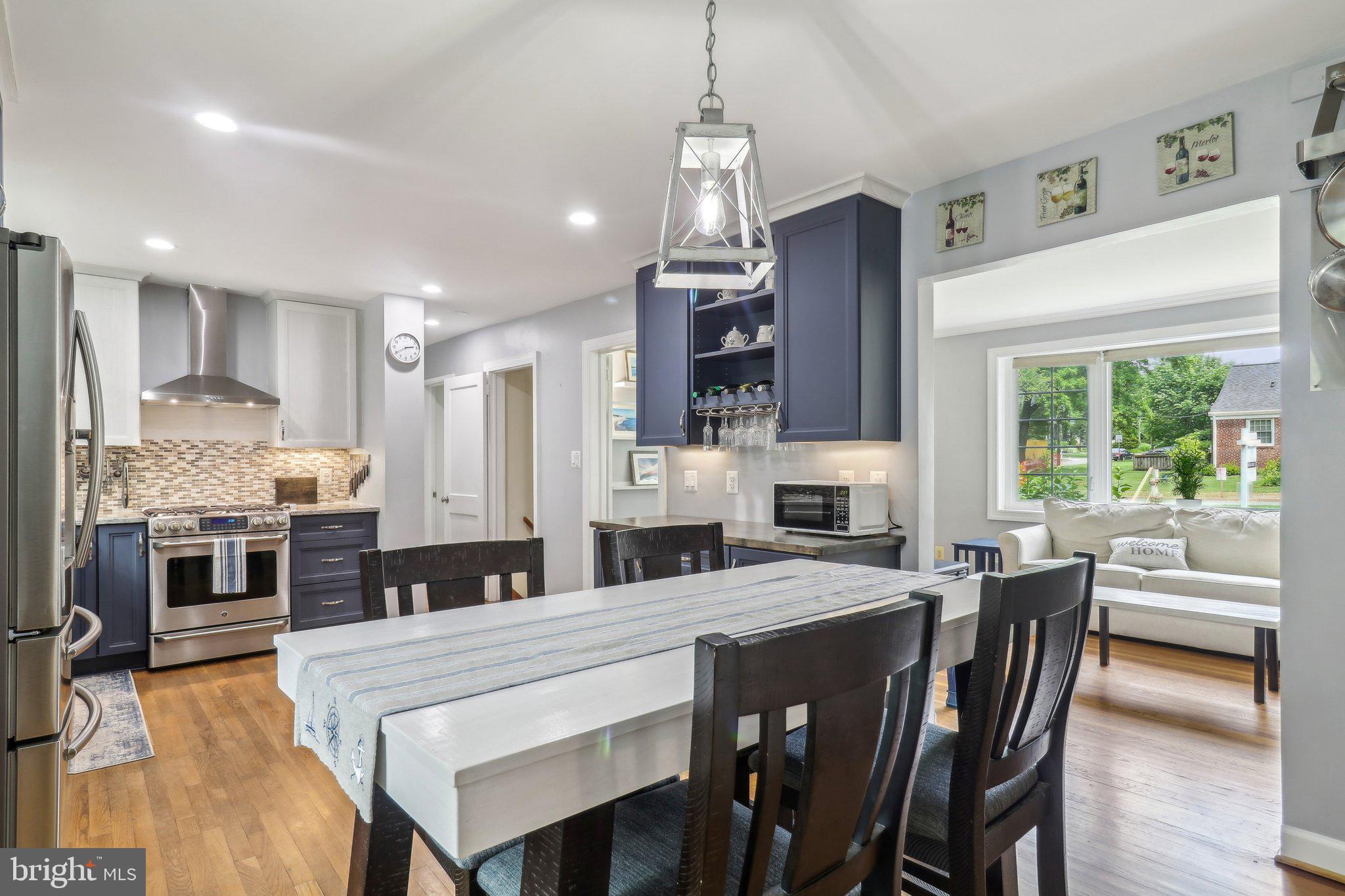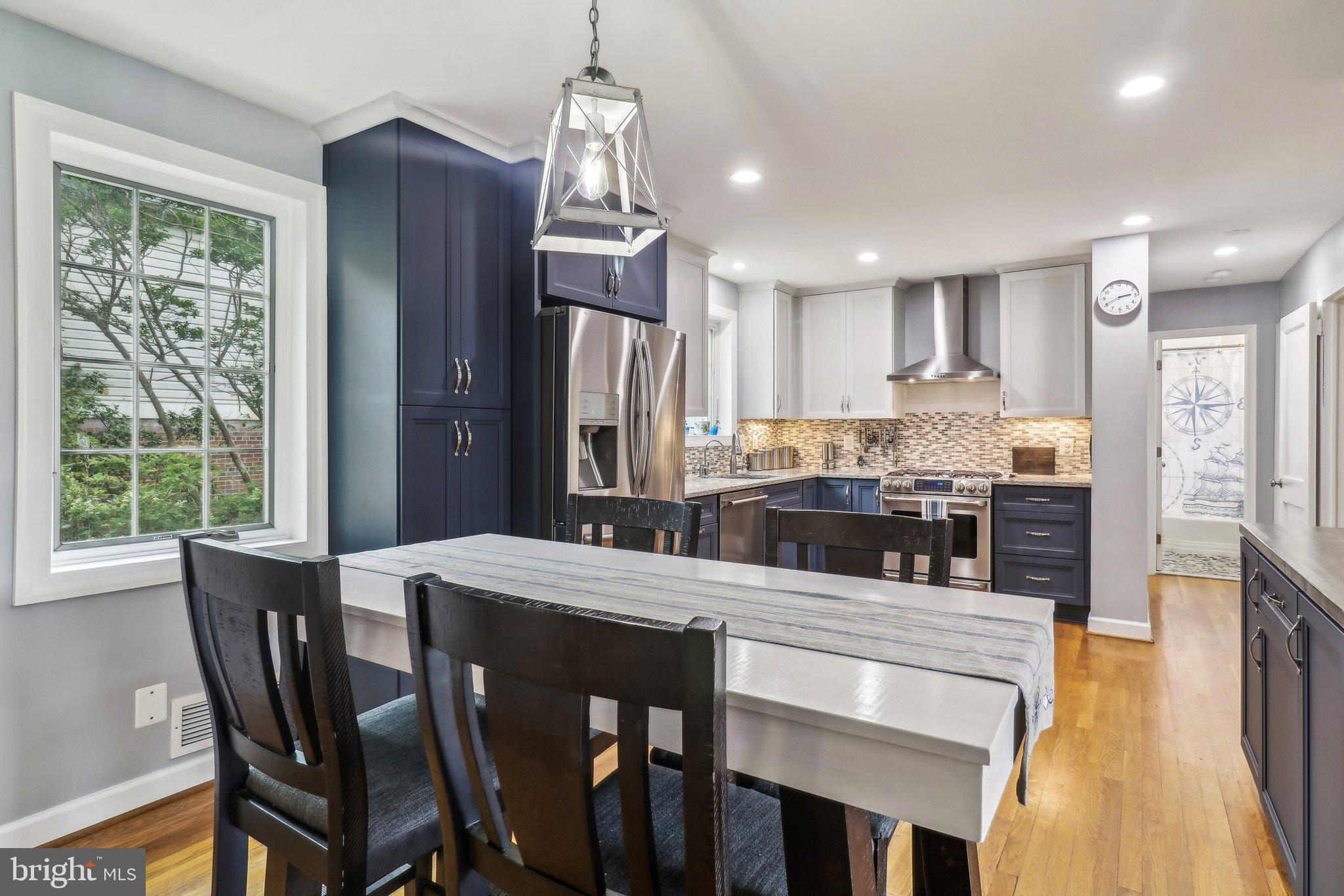 Inside, the living room is all warmth--original hardwoods, a wood-burning fireplace with a fresh tile hearth and painted brick (2023) and a wide bay window (2020) fitted with remote-control shades first installed in 2015. The space opens to the dining area and the 2024 kitchen makeover: two-tone cabinetry, granite that wears everyday life well, a mosaic backsplash, deep pantry storage, built-in wine rack and stem-glass holders, plus stainless appliances that include a gas range ready for serious cooking. Barn doors slide between the kitchen and the adjacent office, and another set closes off the office from a nearby bedroom, giving you flexible work-from-home privacy without eating floor space. An EV outlet added in 2022 sits just outside, so your car charges while dinner roasts.