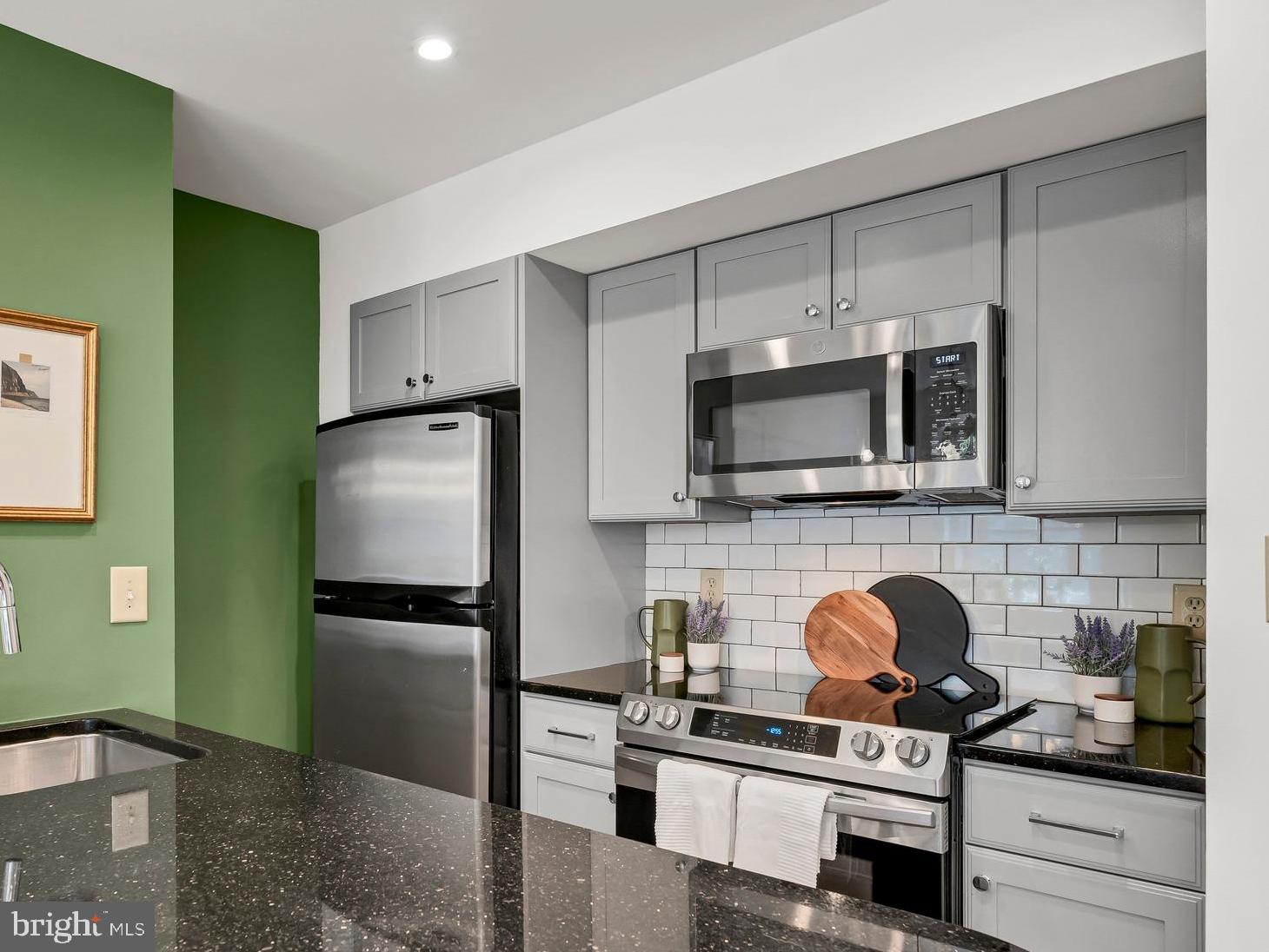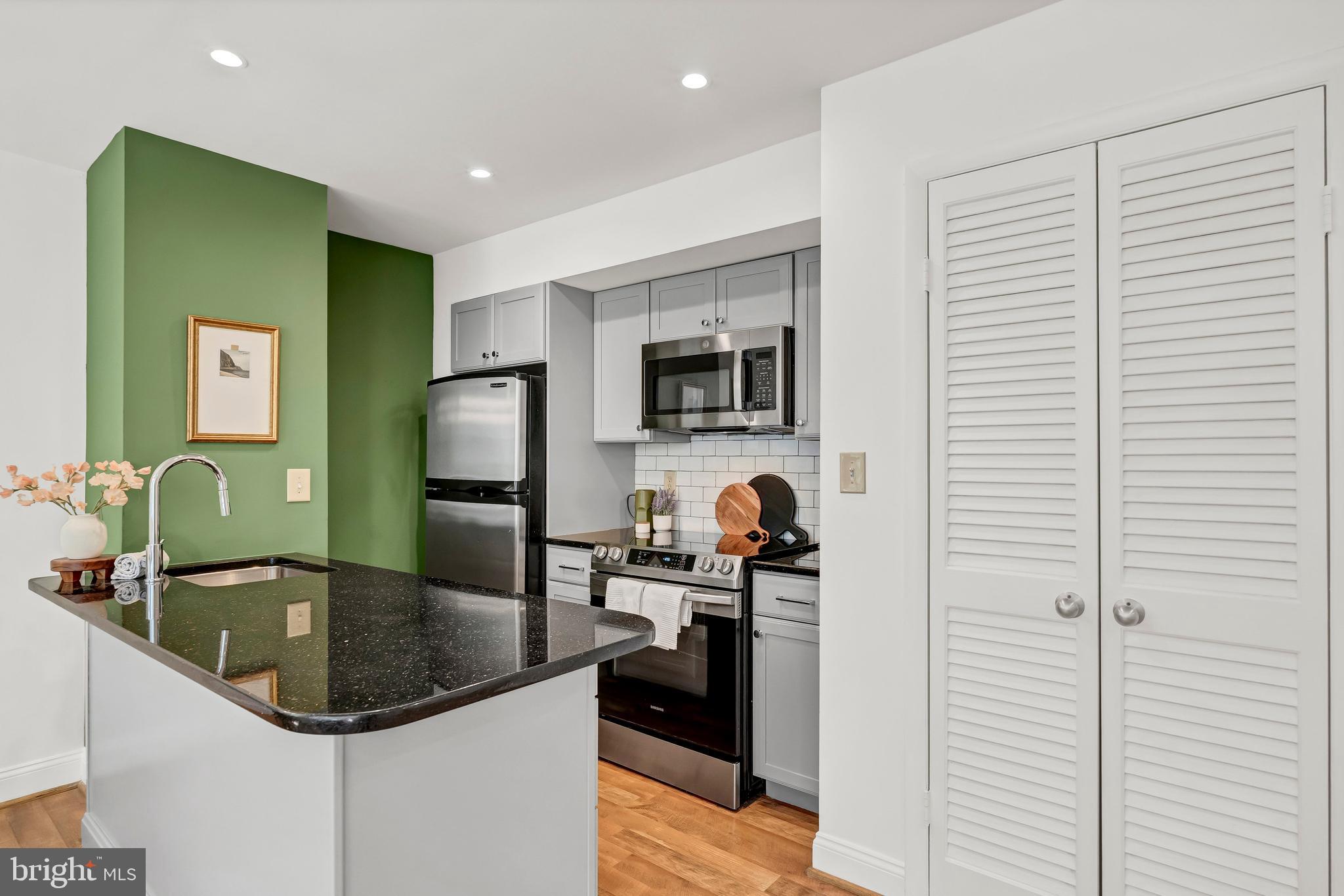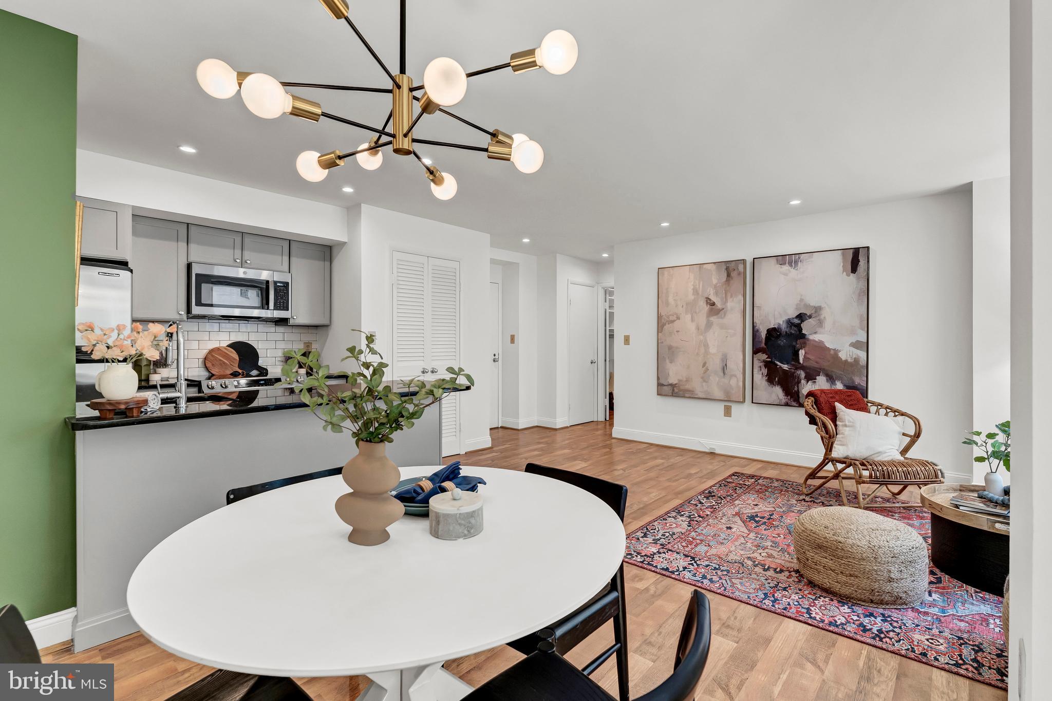 Sunlit and spacious, this condo has a living area with views of the park, lovely dining area, and kitchen with stainless steel appliances and a breakfast bar. The recently replaced full-size washer and dryer are hidden behind louvered doors.