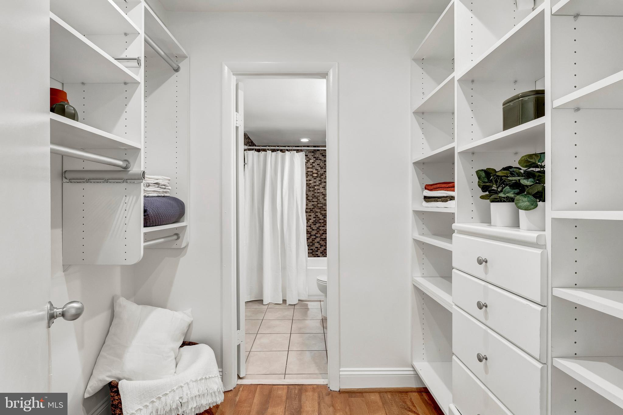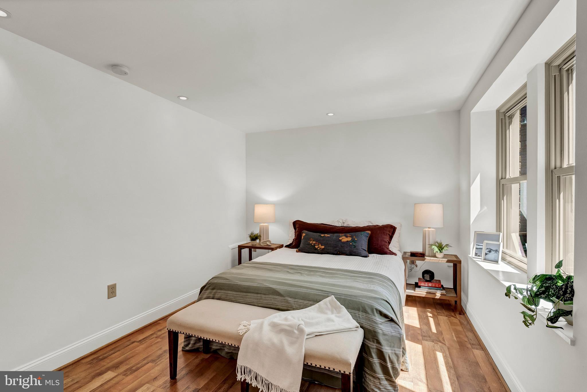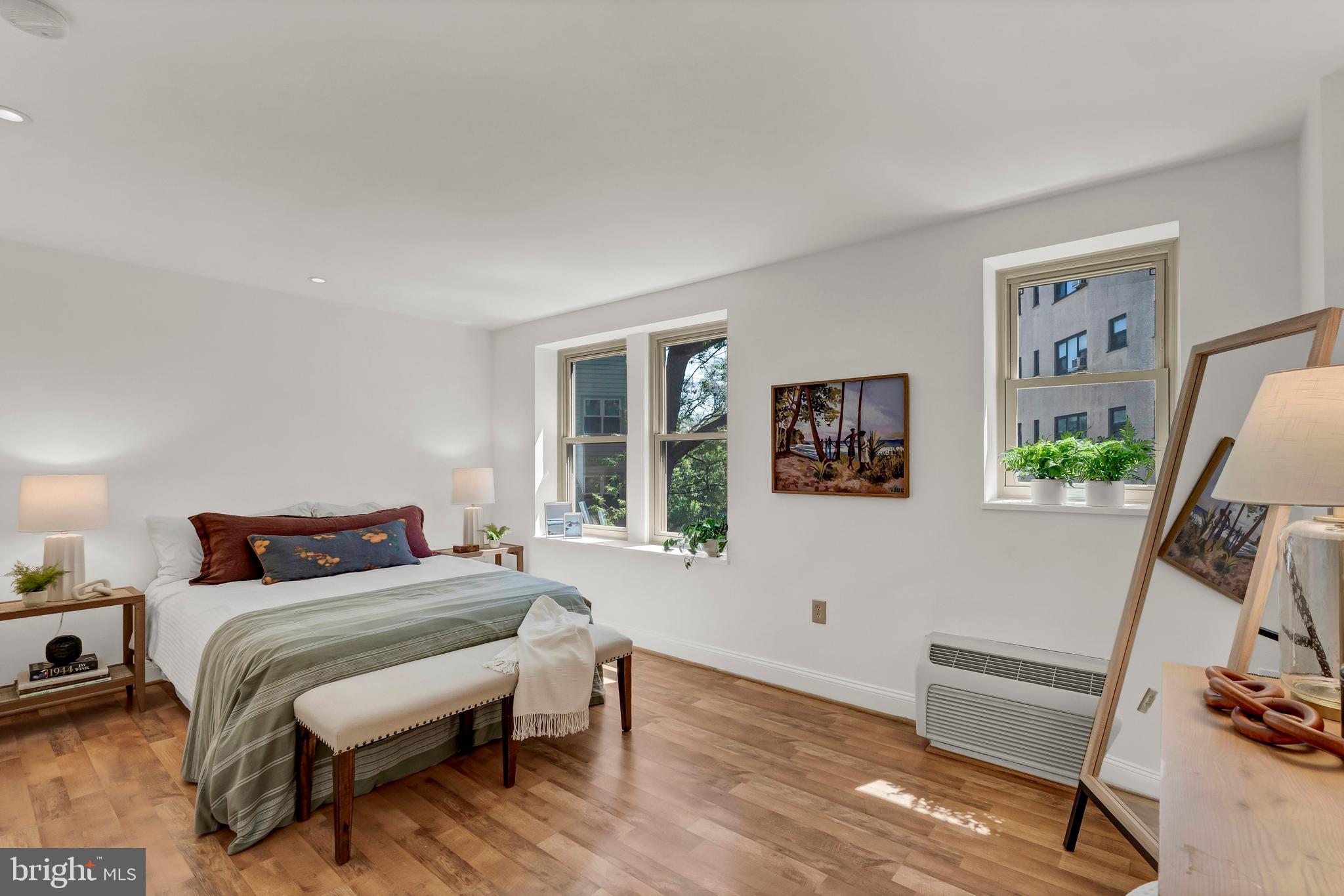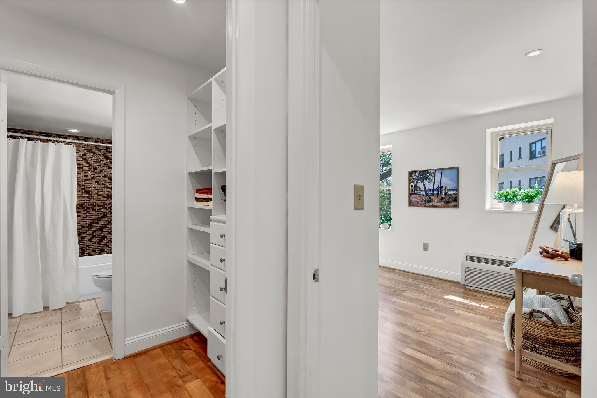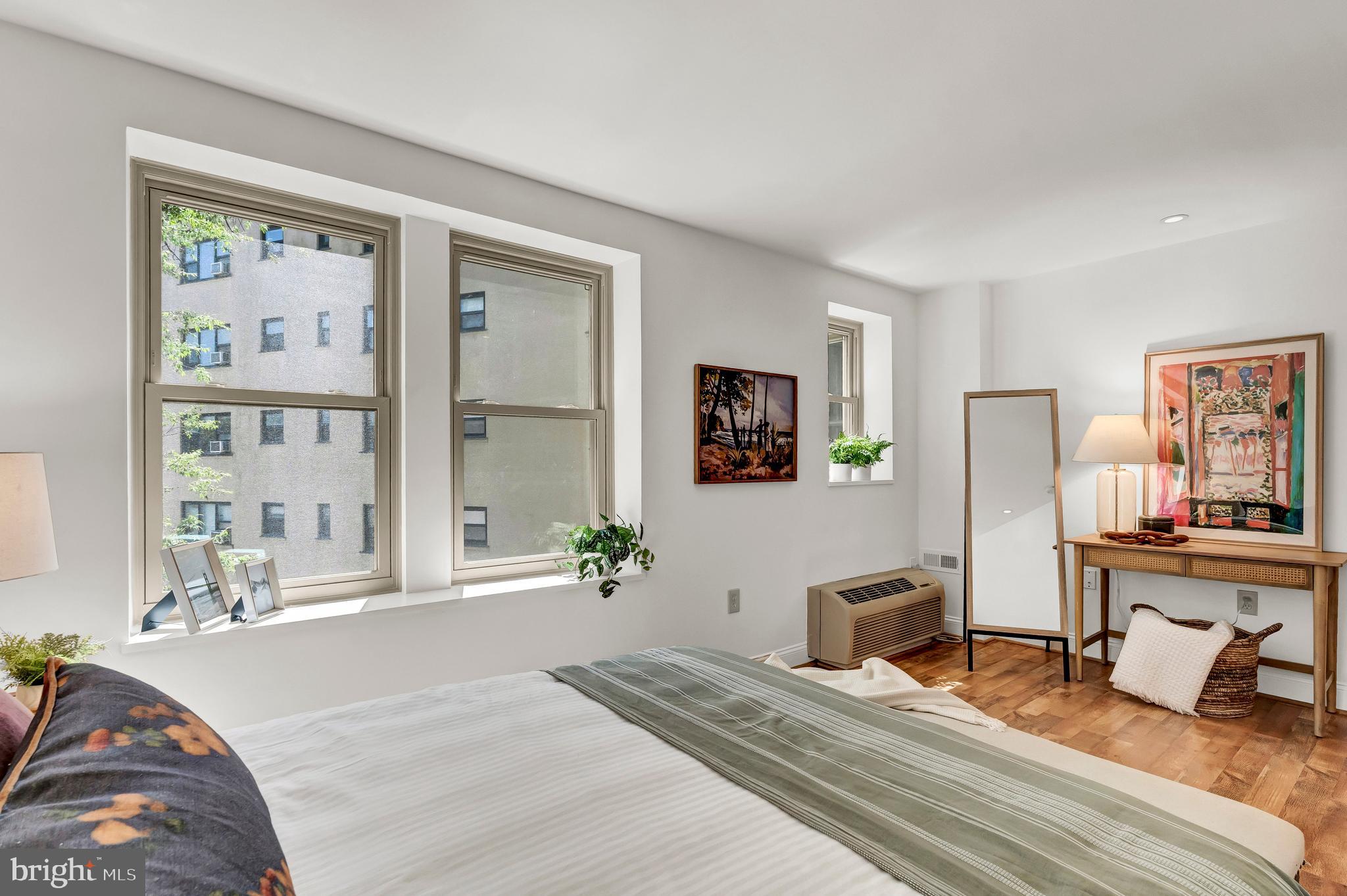The over-sized bedroom offers space for a king size bed - and enough space for a second walk in closet or office nook. The large, professionally outfitted walk-in closet leads to an updated bath with a new vanity, new lighting, and updated fixtures. The floors are a light oak engineered hardwood and the energy efficient and sound-dampening double-paned windows were just installed in March of 2024.